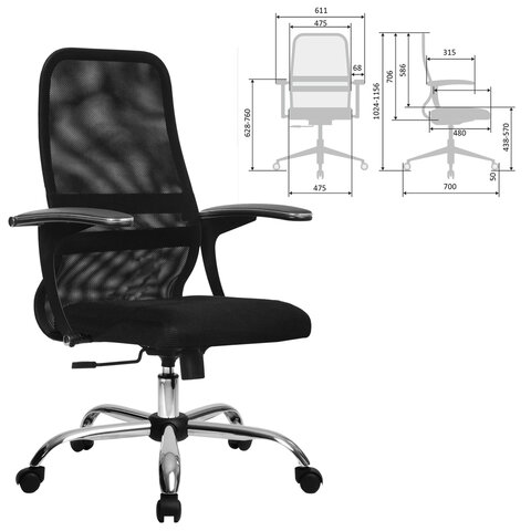 Кресло МЕТТА "SU-C-8-Т" хром, с подлокотниками, ткань-сетка, сиденье мягкое, черное