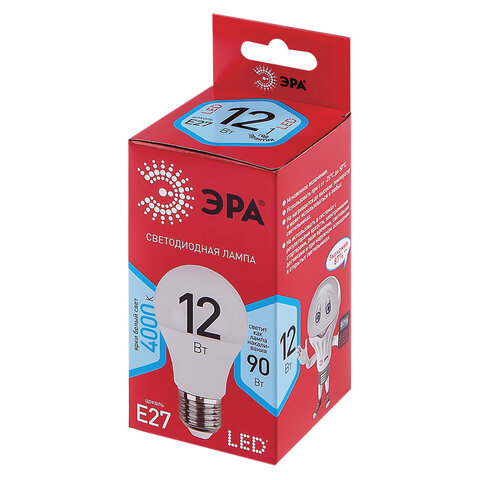 Лампа светодиодная ЭРА RED LINE, 12 (90) Вт, цоколь Е27, груша, нейтральный белый свет, 25000 ч., LED A60-12W-4000-E27, Б0049636