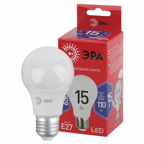 Лампа светодиодная ЭРА RED LINE, 15 (110) Вт, цоколь Е27, груша, холодный белый свет, 30000 ч., LED A60-15W865E27R, Б0046357