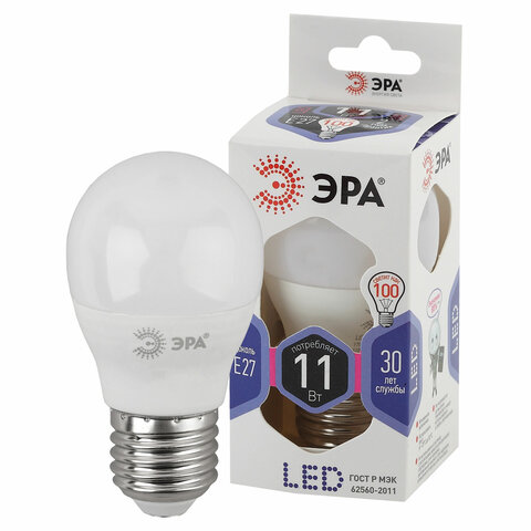 Лампа светодиодная ЭРА STD, 11 (100) Вт, цоколь E27, шар, холодный белый свет, 35000 ч., LED P45-11W-860-E27, Б0032991