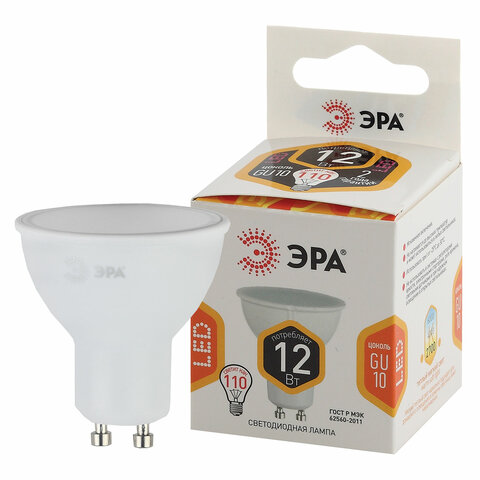 Лампа светодиодная ЭРА STD, 12 (110) Вт, цоколь GU10, софит, теплый белый свет, 35000 ч., LED MR16-12W-827-GU10, Б0040889
