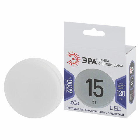 Лампа светодиодная ЭРА STD, 15 (130) Вт, цоколь GX53, таблетка, холодный белый свет, 35000 ч., LED GX-15W-860-GX53, Б0048021