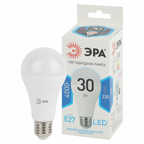 Лампа светодиодная ЭРА STD, 30 (230) Вт, цоколь E27, груша, нейтральный белый свет, 35000 ч., LED A65-30W-840-E27, Б0048016