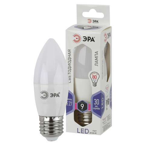 Лампа светодиодная ЭРА STD, 9 (80) Вт, цоколь E27, свеча, холодный белый свет, 35000 ч., LED B35-9W-860-E27, Б0031410