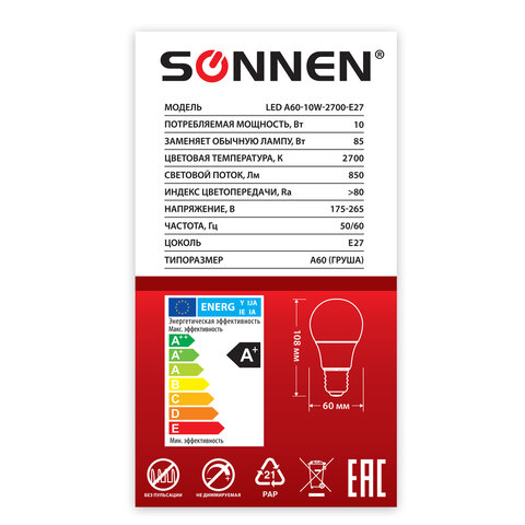 Светодиодная лампа SONNEN компактного размера. Срок службы лампы составляет не менее 30000 часов, что примерно в 30 раз больше, чем у обычной лампы накаливания.