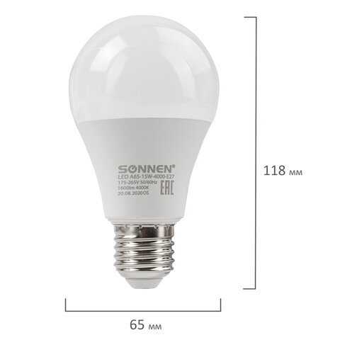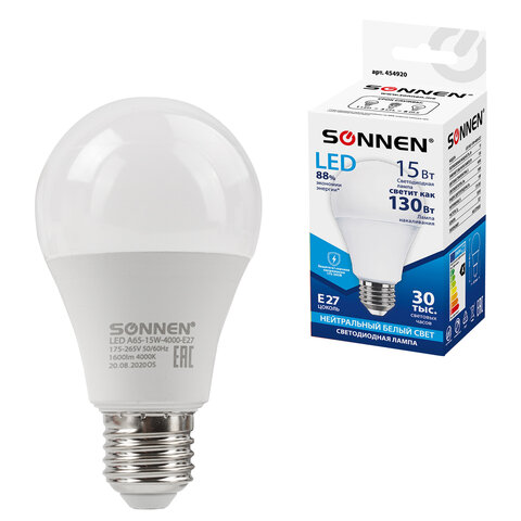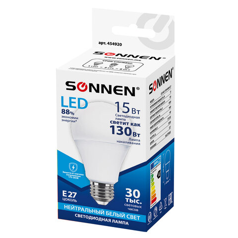 Лампа светодиодная SONNEN, 15 (130) Вт, цоколь Е27, груша, нейтральный белый, 30000 ч, LED A65-15W-4000-E27, 454920