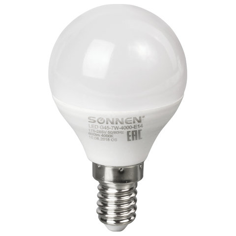 Лампа светодиодная SONNEN, 7 (60) Вт, цоколь Е14, шар, нейтральный белый свет, 30000 ч, LED G45-7W-4000-E14, 453706