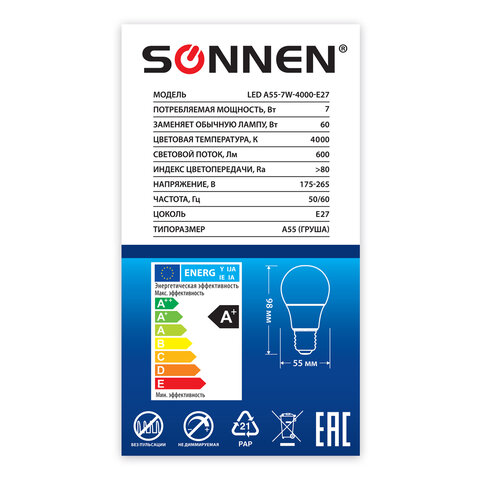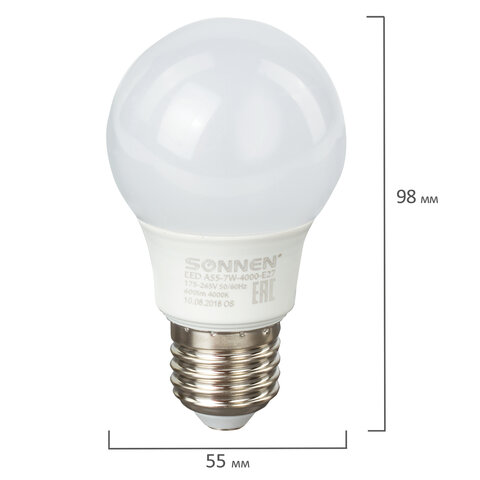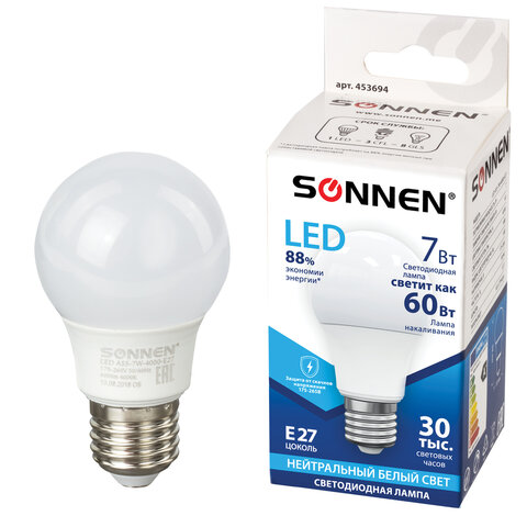 Лампа светодиодная SONNEN, 7 (60) Вт, цоколь Е27, груша, нейтральный белый свет, 30000 ч, LED A55-7W-4000-E27, 453694