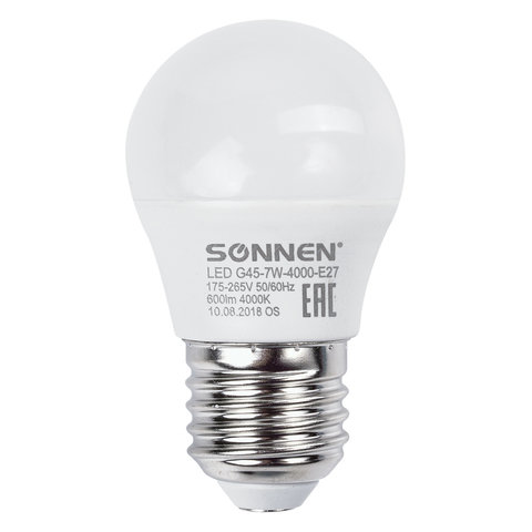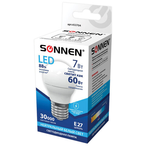 Лампа светодиодная SONNEN, 7 (60) Вт, цоколь E27, шар, нейтральный белый свет, 30000 ч, LED G45-7W-4000-E27, 453704