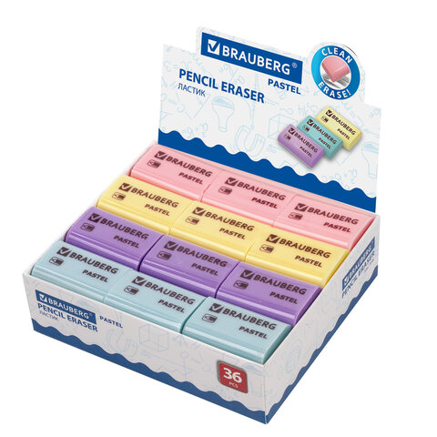 Ластик BRAUBERG "Pastel", 37х24х11мм, ассорти пастельных цветов, экологичный ПВХ, 229582
