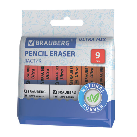 Ластики BRAUBERG "Ultra Mix" 9 шт., размер ластика 41х14х8 мм/29х18х8 мм, натуральный каучук, 229604