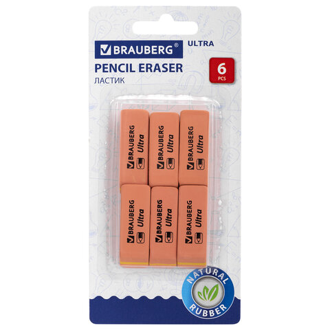 Ластики BRAUBERG "Ultra" НАБОР 6 шт., размер ластика 41х14х8 мм, оранжевые, натуральный каучук, 229601