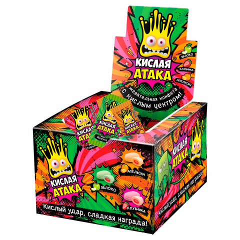 "КИСЛАЯ АТАКА" – это жевательные конфеты с кислым центром, которые понравятся всем любителям кислых вкусов! В линейке представлено три вкуса: апельсин, яблоко и клубника.