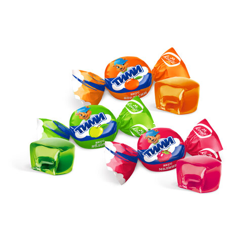 Микс из трех желейных конфет KONTI "Timi" с жидким, сочным центром со вкусами яблока, апельсина и малины.