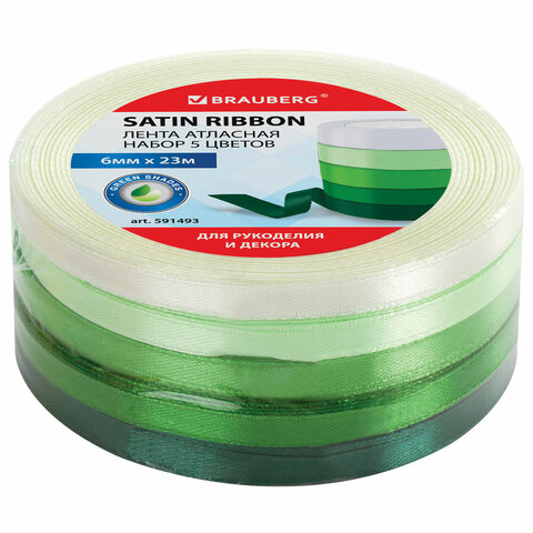 Лента атласная ширина 6 мм, ЗЕЛЕНЫЙ СПЕКТР набор 5 цветов по 23 м, BRAUBERG, 591493