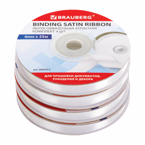 Лента обвязочная атласная БЕЛАЯ, КОМПЛЕКТ 4 шт., ширина 6 мм, длина 25 м, BRAUBERG, 606953