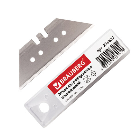 Лезвия для универсальных мощных ножей, 18 мм, BRAUBERG, КОМПЛЕКТ 5 ШТ., форма-трапеция, в пластиковом пенале, 236637