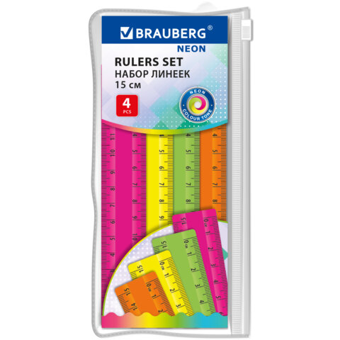 Линейки пластиковые 15 см неоновые BRAUBERG, НАБОР 4 штуки, непрозрачные, пенал, 210881