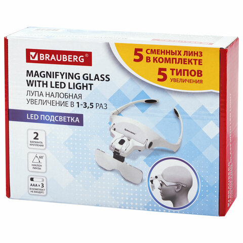 Лупа налобная с LED-ПОДСВЕТКОЙ, 5 сменных линз 95х33 мм, увеличение 1,0 - 3,5, BRAUBERG, 455929