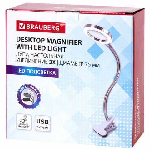 Лупа настольная на прищепке с LED-ПОДСВЕТКОЙ, диаметр 75 мм, увеличение 3, BRAUBERG, 455931