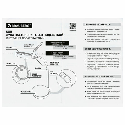 Лупа настольная BRAUBERG с подсветкой предназначена для чтения, просмотра карт, мелких рисунков, шкал, схем, в том числе при отсутствии света или слабом освещении. Усовершенствованная технология освещения, комфортное увеличение.