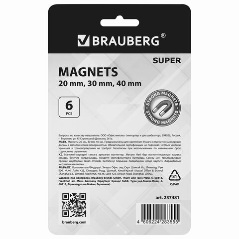 Сильные магниты BRAUBERG "SUPER" предназначены для фиксации и удержания на магнитных досках и металлических поверхностях полиграфической продукции (объявлений, распоряжений, вывесок, постеров, приказов, макетов и т.д.).