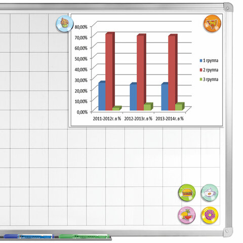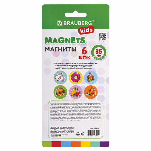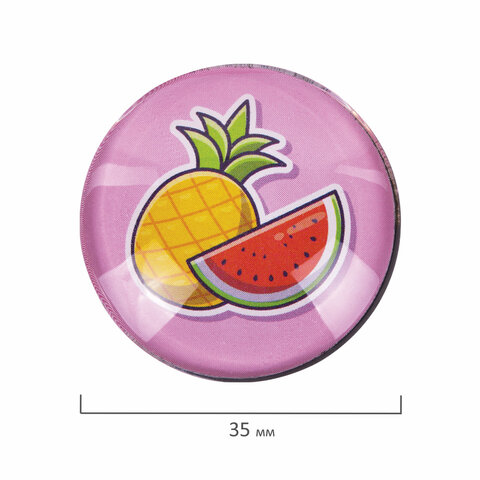 Круглые стеклянные магниты BRAUBERG KIDS с 3D-дизайном "Street Food" надежно прикрепляют листы бумаги к магнитно-маркерной поверхности досок, витрин, флипчартов и холодильников.
