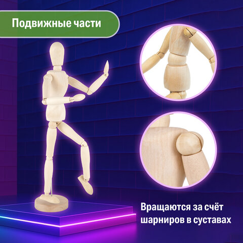 Манекен человека художественный BRAUBERG ART "CLASSIC" выполнен из натурального дерева и изображает человеческую фигуру с подвижными руками, ногами и головой. Он используется художниками для зарисовки различных поз человека.