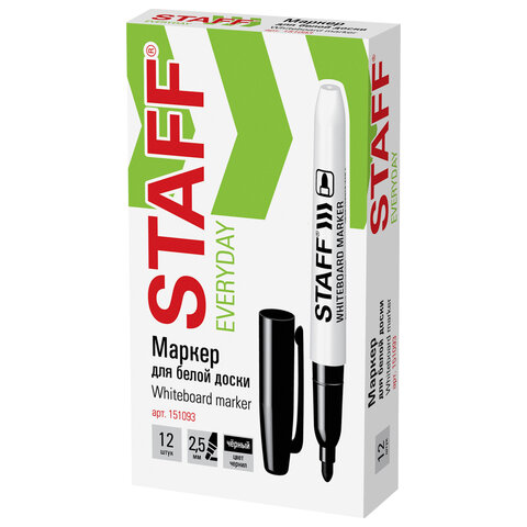 Маркер стираемый для белой доски STAFF "EVERYDAY" WBM-093, ЧЕРНЫЙ, 2,5 мм, тонкий корпус, 151093