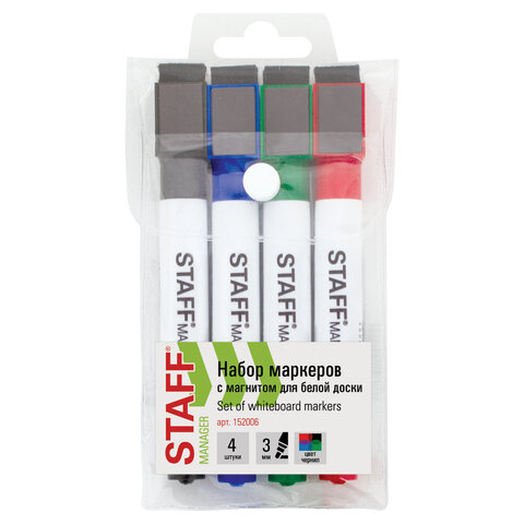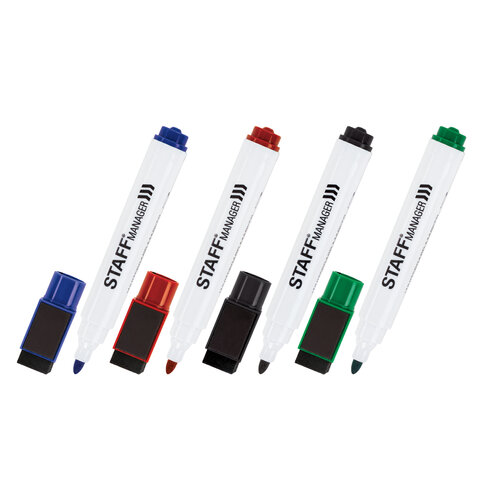 Маркеры для белой доски на магните со стирателем, НАБОР 4 цвета, STAFF "Manager" WBM-002, 3 мм, 152006