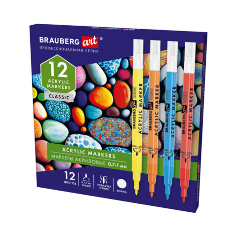 Маркеры акриловые для рисования и хобби 12 ярких цветов, линия 0,7-1 мм, BRAUBERG ART CLASSIC,152521
