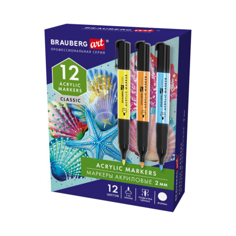 Маркеры акриловые для рисования и хобби, 12 ярких цветов, линия 2 мм, BRAUBERG ART CLASSIC,152519