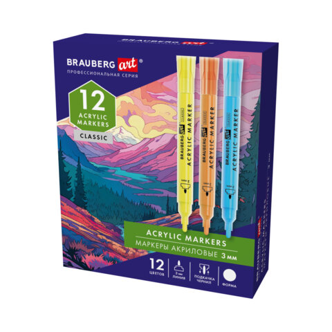Маркеры акриловые для рисования и хобби, 12 ярких цветов, линия 3 мм, BRAUBERG ART CLASSIC, 152525