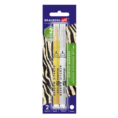 Маркеры акриловые для рисования и хобби, 2 цвета ЗОЛОТО/СЕРЕБРО, линия 0,7-1 мм, BRAUBERG ART, 152528