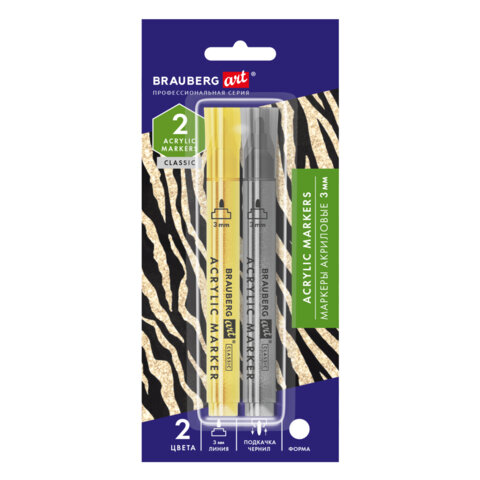 Маркеры акриловые для рисования и хобби, 2 цвета ЗОЛОТО/СЕРЕБРО, линия 3 мм, BRAUBERG ART, 152530