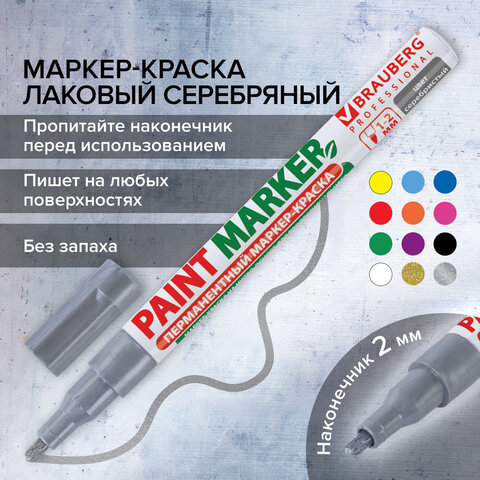 Маркер-краска лаковый (paint marker) 2 мм, СЕРЕБРЯНЫЙ, БЕЗ КСИЛОЛА (без запаха), алюминий, BRAUBERG PROFESSIONAL, 150866