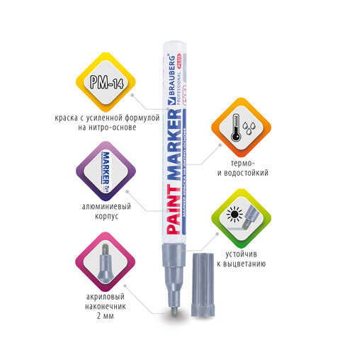 Маркер-краска лаковый BRAUBERG предназначен для маркировки различных материалов в промышленных условиях: бетона, дерева, стекла, металла, резины, пластика. Заправлен краской с усиленной формулой на нитро-основе РМ-14.