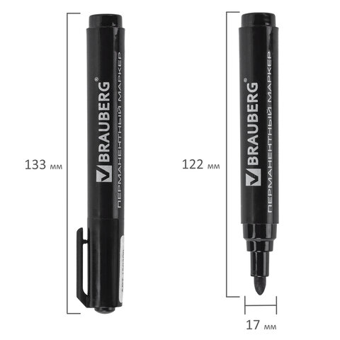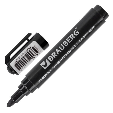 Маркер перманентный BRAUBERG "Classic", ЧЕРНЫЙ, круглый наконечник, 3 мм, с клипом, 150300