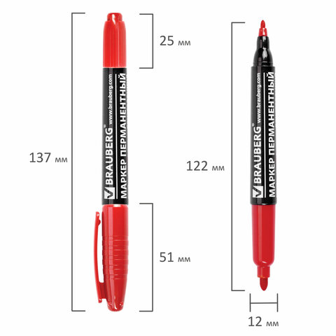 Маркер перманентный двусторонний BRAUBERG, КРАСНЫЙ, круглый наконечник 2/4 мм, 150838
