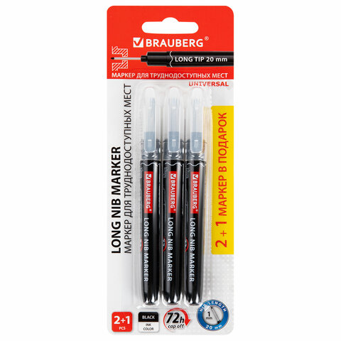 Маркер строительный с длинным наконечником многофункциональный для труднодоступных мест, НАБОР 3шт., ЧЕРНЫЕ, 1мм, BRAUBERG UNIVERSAL, 152541