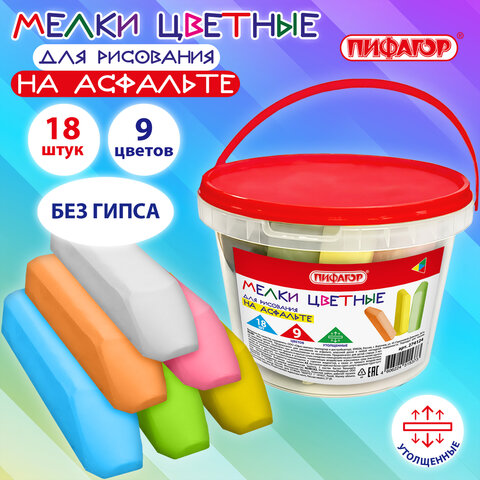 Мел в ведерке для рисования на асфальте 18 штук, ПИФАГОР, цветной квадратный УТОЛЩЕННЫЙ, 274124