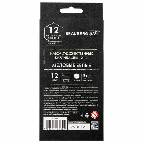 Карандаши МЕЛОВЫЕ художественные белые, НАБОР 12 шт., BRAUBERG ART CLASSIC, грифель 4 мм, 181897