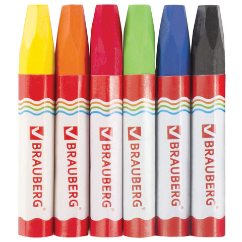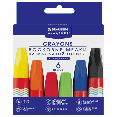 Восковые мелки утолщенные BRAUBERG "АКАДЕМИЯ", НАБОР 6 цветов, на масляной основе, яркие цвета, 227294