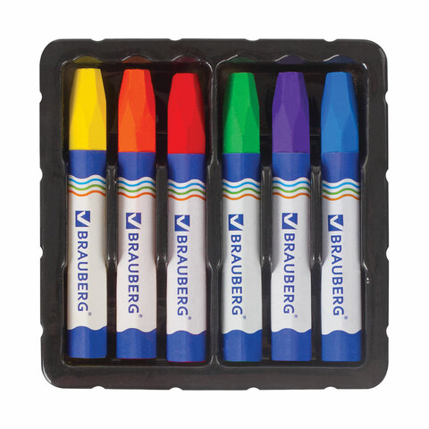 Восковые мелки утолщенные BRAUBERG, НАБОР 6 цветов, на масляной основе, яркие цвета, 222969
