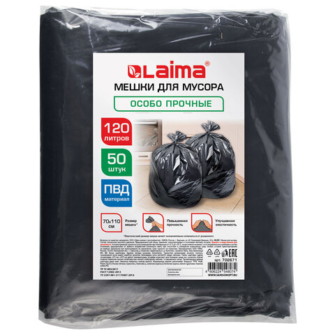 Мешки для мусора 120 л, черные в пласте 50 штук особо прочные, ПВД 40 мкм, 70x110 см, LAIMA, 702671