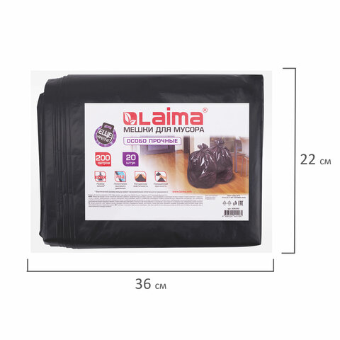 Мешки для мусора 200 л, черные, в пачке 20 шт., особо прочные, ПВД 50 мкм, 90х130 см, LAIMA