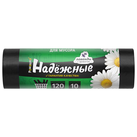 Мешки для мусора с ушками 120 л, черные в рулоне 10 шт., ПСД 16,5 мкм, 70x110 см, РОМАШКА НАДЕЖНЫЕ, ВЛ12001У
