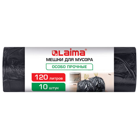 Мешки для мусора с завязками 120л черные в рулоне 10шт особо прочные ПВД 65мкм 70x95см, LAIMA, 702669