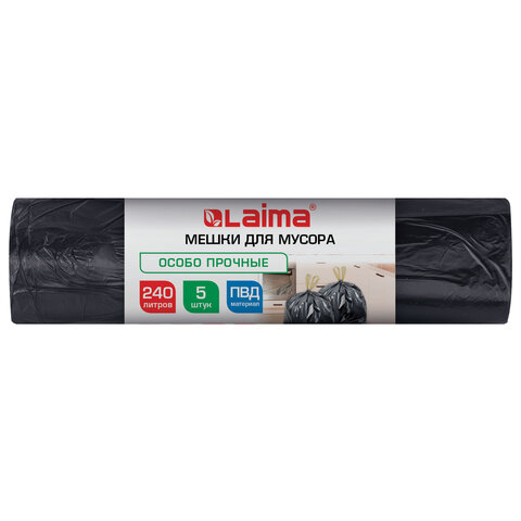 Мешки для мусора с завязками 240л черные в рулоне 5шт особо прочные ПВД 60мкм 110x120, LAIMA, 702686