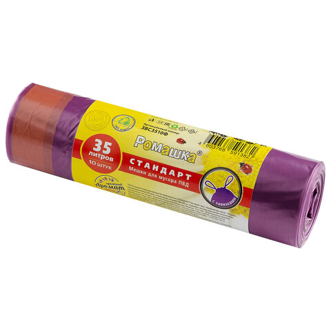Мешки для мусора с завязками 35 л., фиолетовые, в рулоне 10 шт., ПВД 25 мкм, 50х58 см, РОМАШКА, ЗВС3510Ф